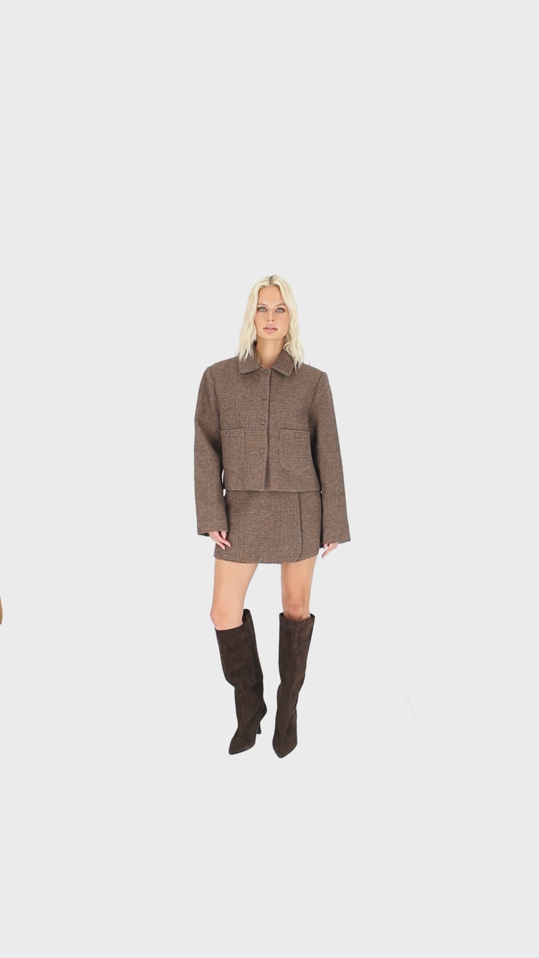 Stilingas rudeniškas dviejų dalių kostiumėlis. Trumpas, laisvo silueto švarkelis ir mini šortai. Švarkelis pasižymi tiesaus kirpimo konstrukcija, paslėptomis sagomis ir dviem didelėmis kišenėmis priekyje. Šortai išlaiko elegantišką, bet tuo pačiu jaunatvišką įvaizdį. Struktūruotas audinys su subtiliu raštu suteikia prabangos pojūtį, o rudai pilkas atspalvis – universalumo derinant su kitais garderobo elementais.