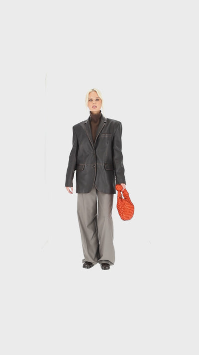 Dviejų sagų užsegimas, klasikiniai atlapai ir subtiliai šiuolaikiškas dizainas. Ypatybės: natūrali oda, rudi kontrastiniai apsiuvimai siūlėse ir kišenėse, dviejų sagų užsegimas, klasikiniai atlapai, tiesus, šiek tiek oversized siluetas. One size.
