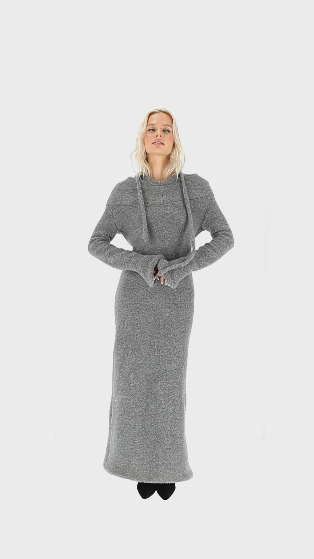 Vilnos maxi suknelė. Ypatybės: ilga vilnos stiliaus suknelė / megztinis, su dideliu gobtuvu, one size ir prisitaiko prie kūno linijų.